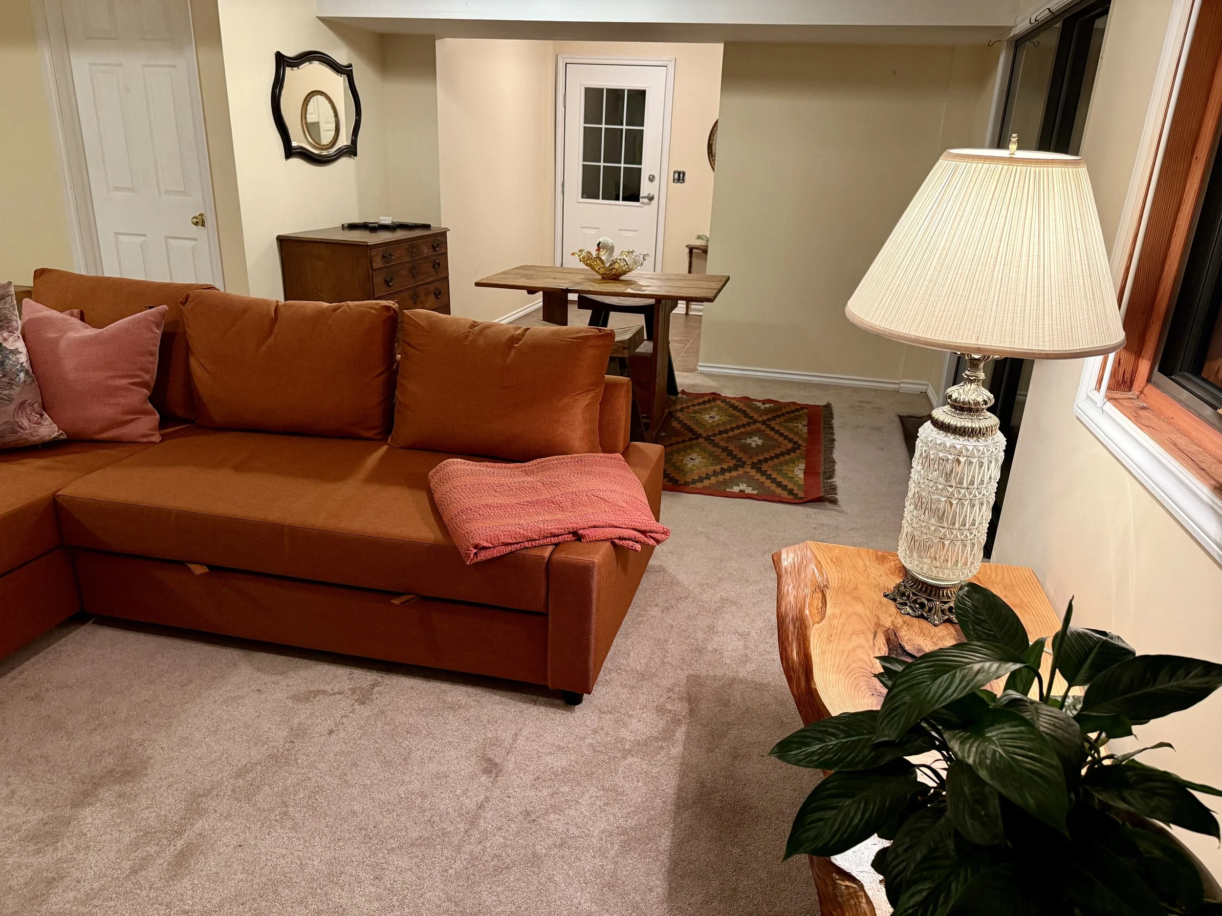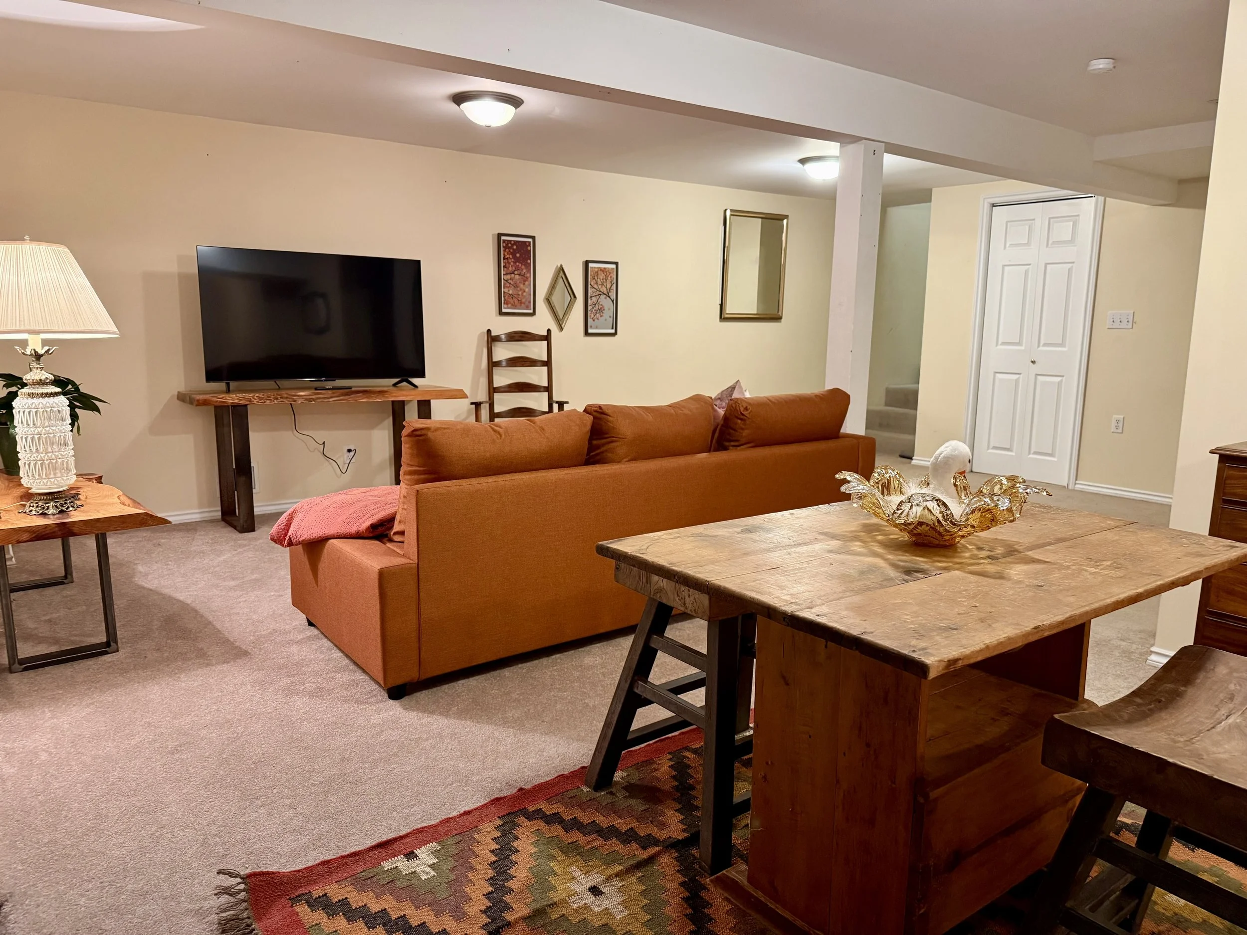 Family Room -Comfortable lounge area for movies, games, or quiet evenings, Walk-out access to the patio and garden, Queen sleeper sofa for additional guests, Bedroom: Queen bed, Full Bathroom: Sink, Toilet, Soaker tub for unwinding after a day of exploring