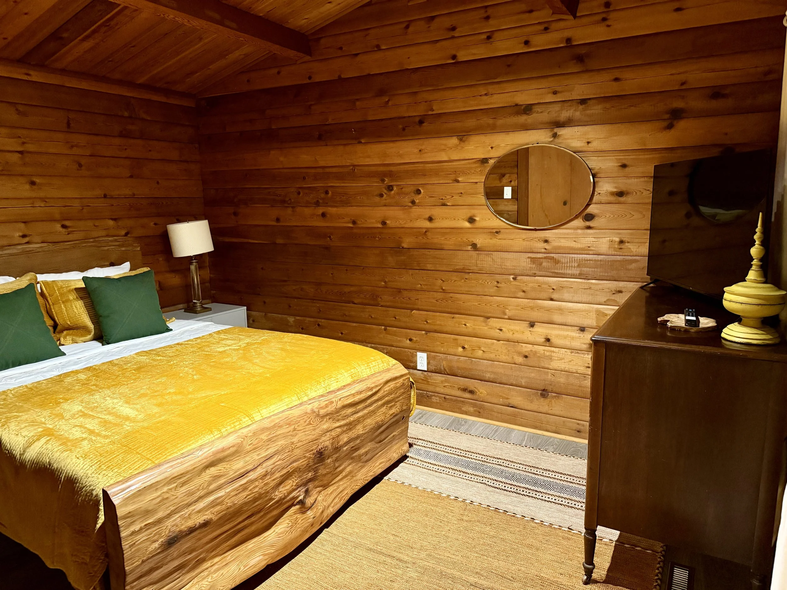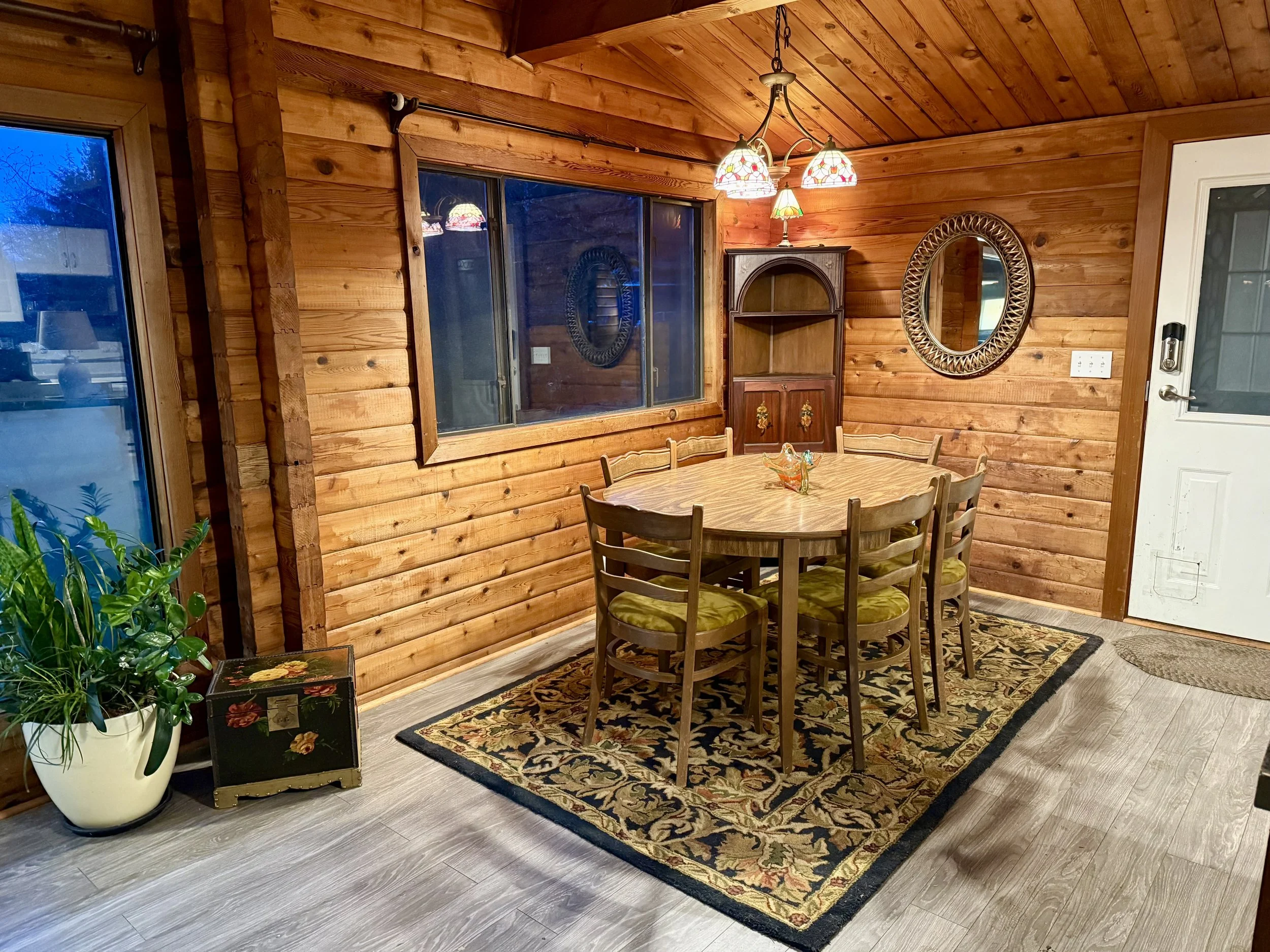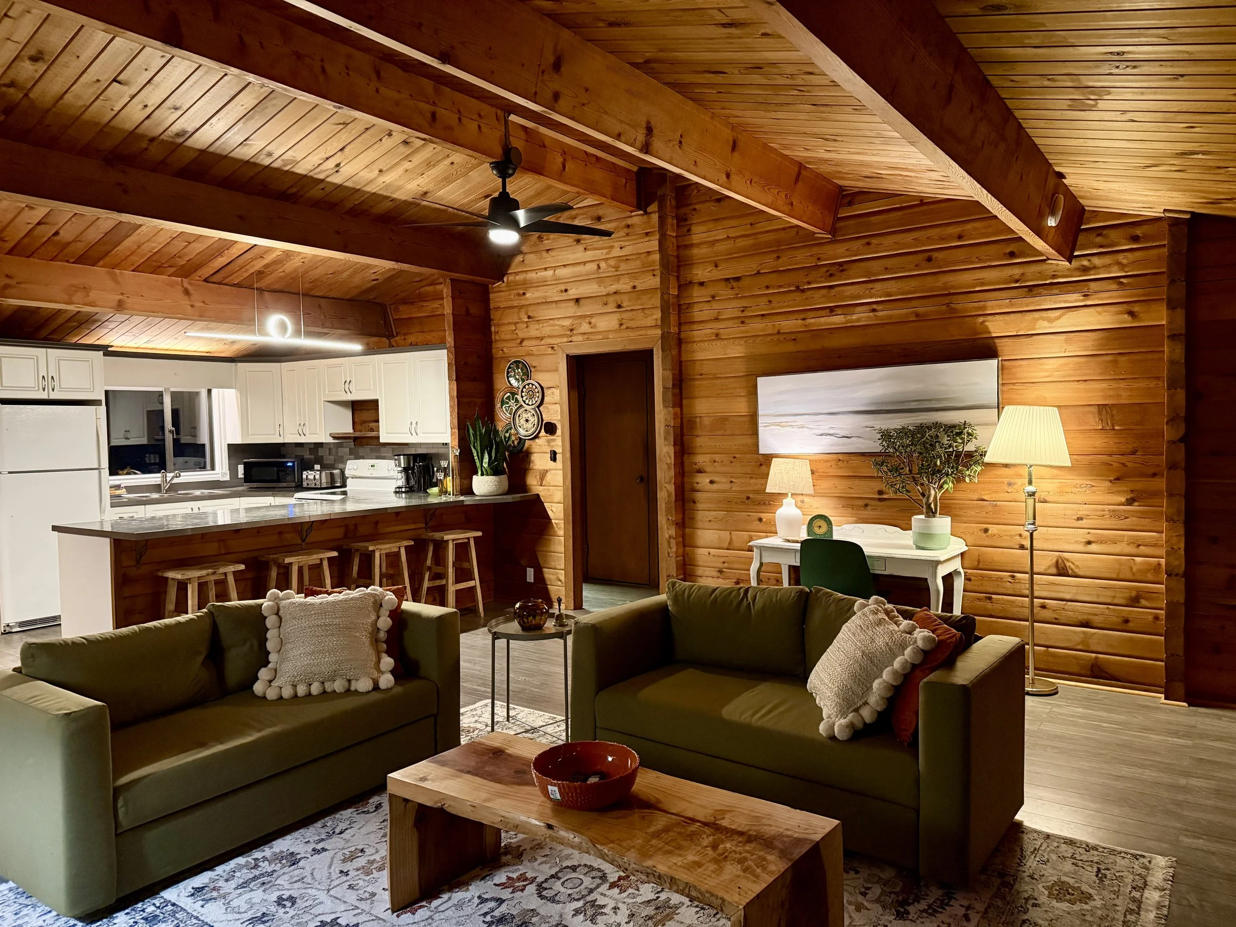 Main Level – Vintage Log Architecture Meets Contemporary Comfort. The upper floor showcases the home’s original cedar-log construction, creating a warm and inviting atmosphere enhanced by updated furnishings and spacious open-concept design.